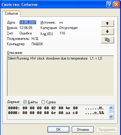 Заходя в администрирование-> просмотр событий->система, вижу следущее: ошибка, источник nv, категория отсутствует, событие 110. Расскрыл ошибку вижу дальше Silent Running: HW clock slowdown due to temperature. L2-> L1. Перестовлял винду не помогло. Кто знает с чем дело. Помогите. Спасибо. |