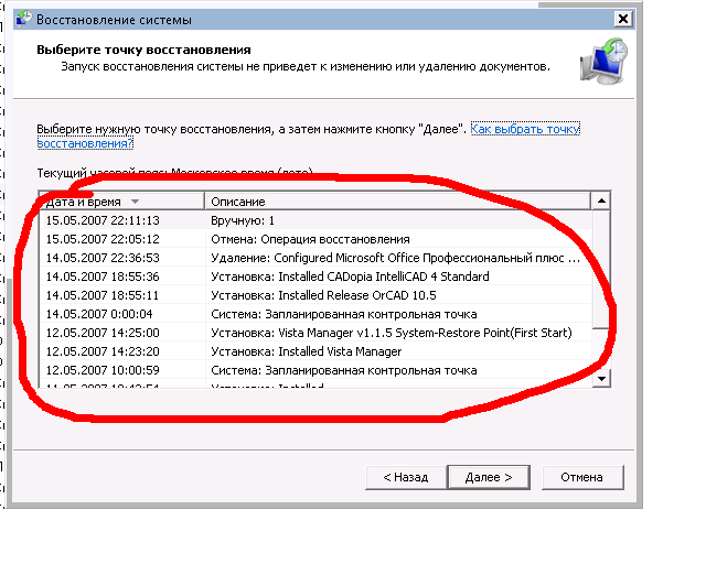 В 1.png видно что последняя точка делалась 16.05.07 в 8.01.41, УСПЕШНО, по расписанию при включении компьютера, но в файле 2.png её нету, вот в этом то и проблема. Виста была установлена 11.04.07, т.е. больше месяца назад, точек видно только за последние 4 дня. Напрягает что после установки к примеру глюкавого Outposta нельзя просто откатиться назад, как на XP, а приходиться вырезать его ручками. |