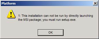 Профиль | Сайт | Отправить PM | Цитировать Так вот и надо запускать из setup'а. А вот дальше вылезает реальная проблема. Запускать установку напрямую из msi нечасто возможно. Если бы у Вас всё работало, Вы бы увидели сообщение как в прикрепленном файле