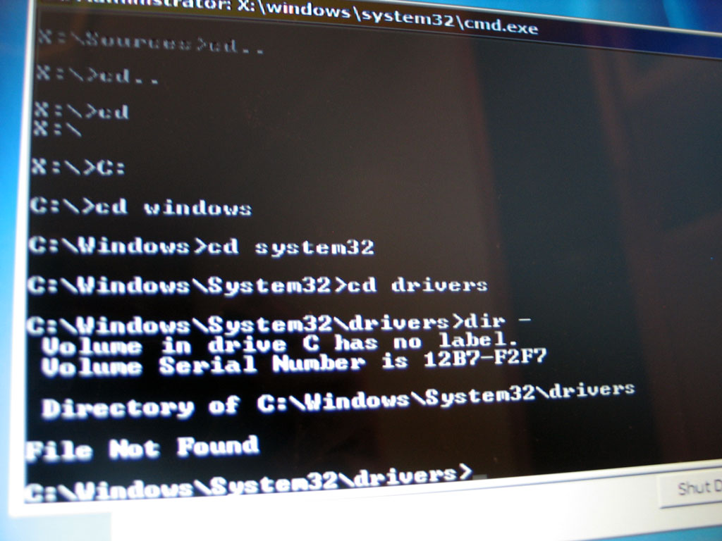 1. Установочного диска нет 2.3.Установочного диска нет, но скачал Vista Recovery Disc, записал на болванку и запустил. Точек возврата, при попытке запустить System Restore не обнаружилось.Значит ли это что и при попытке восстановить систему с помощью установочного диска (если-бы он имелся) точек возврато найдено не будет? Вошёл в командную строчку, дабы выполнить удаление драйверов "Алкоголя". При открытии "cmd" путь прописан как X:\windows\system32\cmd.exe Как написано в "шапке" командой cd.. ,поднятия на уровень выше не происходит. Просто ввёл "C:" каталог сменился на C:\ далее командами "cd windows" "cd syste32" "cd drivers" захожу в папку с драйверами, ввожу команду dir - в результате получаю вот что (см. прикрепленное Изображение) : C:\Windows\System32\drivers>dir - Volume in drive C has no label Volume Serial Number is 12B7-F2F7 Directory of C:\Windows\System32\drivers File Not Found 4. Записать Live CD нет возможности. P.S. прочитал все 10 страниц темы. Касательно своего вопроса по командной строке, ничего не нашёл. |