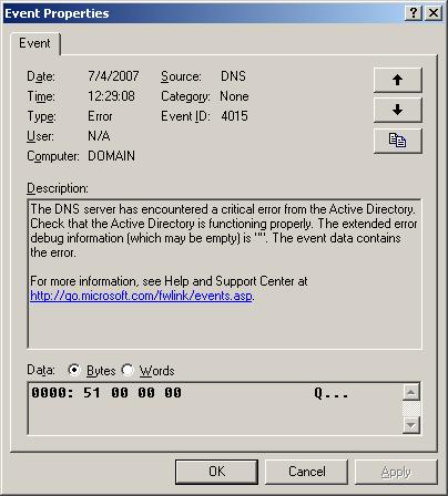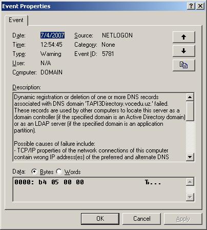 2-ошибки явно указывают на проблемы с ДНС. Комментарии можно прочесть здесь http://eventid.net/display.asp?event...ce=DNS&phase=1 3-проверьте сервер с помощью утилит dcdiag, netdiag, nslookup... |