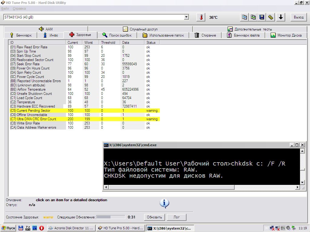 Профиль | Отправить PM | Цитировать Ноутбук выключился и больше не загружается. При запуске выдает ошибку загрузки операционной системы (стояла ХР). Запустился с флешки. Программы вроде Acronis диск видят, но в строке "Файловая система" стоит "Не отформатирован". ChkDsk тоже не хочет работать, HD Tune выдаёт два предупреждения (на скрине).