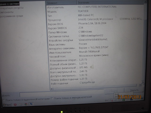 ниже характеристики и фото бука: Тип ЦП Mobile Intel Celeron M 320, 1300 MHz Системная плата FIC COMPUTERS INTERNATIONAL FEATHER Чипсет системной платы Intel Montara-GM+ i855GME Системная память 1264 Мб (DDR SDRAM) DIMM1: Samsung M4 70L3224FT0-CB0 256 Мб PC2100 DDR SDRAM DIMM2: GoodRAM GR400S64L3/1G 1 Гб PC3200 DDR SDRAM Тип BIOS Phoenix 1,0А (06/18/04) 3D-акселератор Intel Extreme Graphics 2 Звуковой адаптер Realtek ALC202(A) @ Intel 82801DBM ICH4-M Контроллер IDE Intel(R) 82801DBM Ultra ATA Storage контроллер - 24CA Дисковый накопитель IC25N030ATMR04-0 ATA Device (30 Гб, 4200 RPM, Ultra-ATA/100) Оптический накопитель TOSHIBA DVD-ROM SD-R9012 ATA Device (DVD:8x, CD:16x/10x/24x DVD-ROM/CD) |