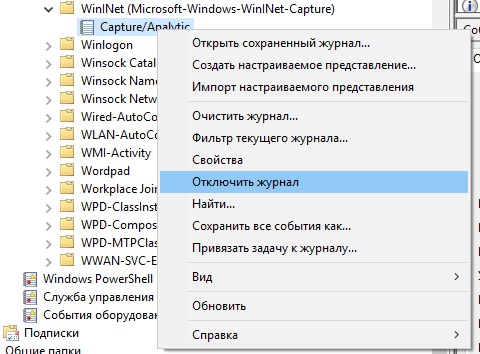 Этот компьютер » ПКМ » Управление » Просмотр событий » Журнал приложений и служб » Microsoft » Windows » WinlNet (Microsoft-Windows-WinlNet-Capture) » Capture/Analytic » ПКМ » Отключить журнал. |