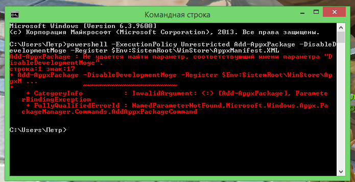 [q=Petya V4sechkin]и для магазина: Код: powershell -ExecutionPolicy Unrestricted Add-AppxPackage -DisableDevelopmentMode -Register $Env:SystemRoot\WinStore\AppxManifest.XML и у меня вышло такая ошибка http://forum.oszone.net/attachment.p...1&d=1415025103 |
