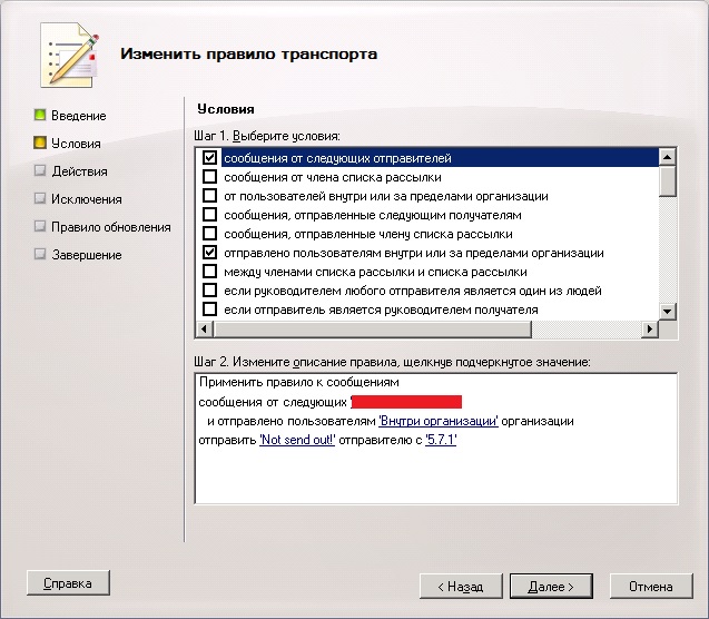 Не могу настроить правила транспорта на запрет отправки во вне. Создаю правило: "Применить правило к следующим сообщениям от следующих "адрес юзера" и отправлено пользователем 'Вне организации' организации отправить 'бла бла' отправителю с '5.7.1'" Не отрабатывает Для проверки работы правила меняю его немного: "Применить правило к следующим сообщениям от следующих "адрес юзера" и отправлено пользователем 'Внутри организации' организации отправить 'бла бла' отправителю с '5.7.1'" Такое правило отрабатывает и при отправке на внутренней адрес срабатывает Но и при отправке на тот же mail.ru срабатывает это же правило Не могу понять почему exchange думает что mail.ru это внутри организации, т.е. внутри моего домена, это где то в домене проблема или в настройках exchange. Вот такой вопрос |