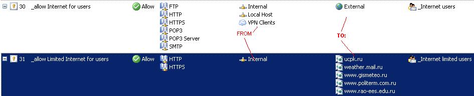 № 30 - разрешить интернет для группы пользователей интернета. На любой сайт. № 31 - разрешить выход только на указанные сайты другой группе пользователей интернета. |