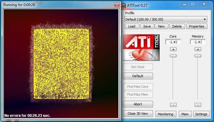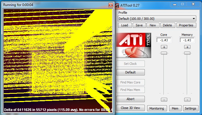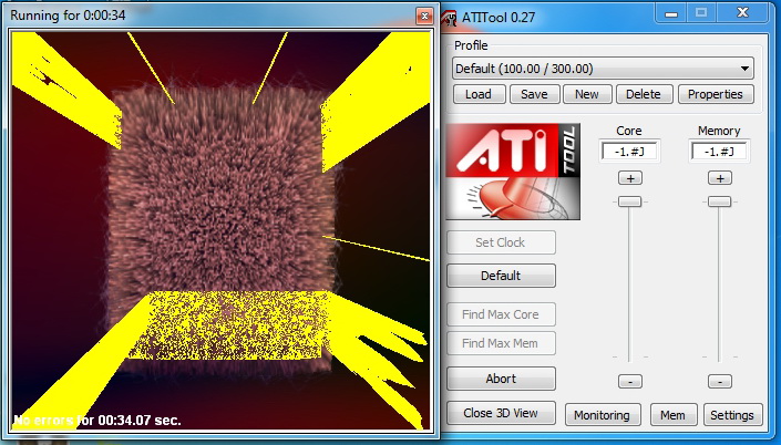 Решил проверить её на AtiTool v 0.26, также v 0.27 Если нажать Close 3D View то куб крутится и все ок (10+ минут проверял) Если нажать Scan for Artifacts то через 1-2 секунды после запуска начинается вот такая фигня как на рисунках (на обеих версиях программы) Также проверял эту видеокарту программами FurMark , TessMark и GPU Caps Viewer - все видео были нормальными без глюков. Температура при крит нагрузке выше 65 градусов не поднималась. Проц Core i5-750, мать P7P55D, БП - Chieftec CFT-650-14C Разгоном не занимался. Это нормально или нет что AtiTool выдает такие желтые полоски при тесте на стабильность??? АтиТул 2007г (последняя версия) может это играет какую то роль, но тогда и в старых играх могут быть глюки или все таки это видеокарта плохая ? |