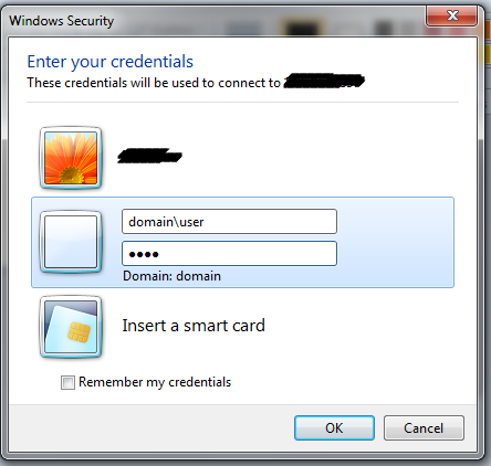 ![]() Если пробуешь зайти из компа который не в домене то нужно писать первый раз. А если нужно подключиться локальным пользователем то уже писать вместо domain имя компа\локальный пользователь. |