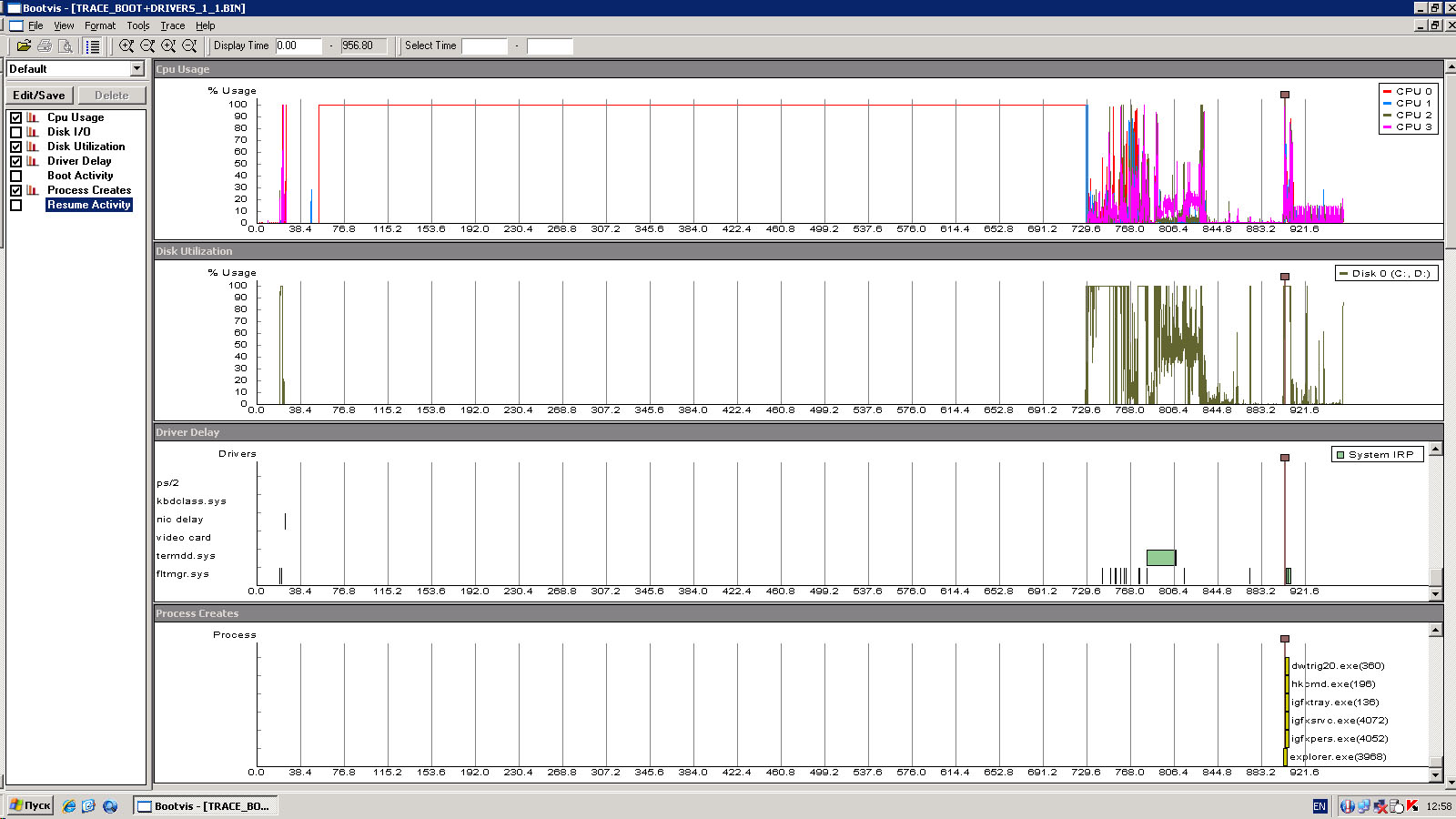 Долго грузится сервер (роутер). Пр загрузке происходит следующее: 1. Проходит тест стартовый экран BIOS, начинает грузиться ОС (черный экран с Windows 2003 и бегающей строкой), 2. после этого черный экран без курсора, висит минут 15, индикатор монитора зеленый, в стендбай не уходит, активности диска нет. На этом этапе обычно экран голубой и проходят сообщения "подготовка сетевых соединений" и т.п. 3. Потом отвисает и сразу приглашение "нажмите ctrl-alt-del" и "сбой при запуске как минимум одной службы" В журналах ошибок нет, диск тестил, битых секторов нет. Видео встроенное, поставил pci-e, без изменений. Из домена выводил/вводил, не помогло. с LiveCD грузится нормально. Службы после загрузки смотрел -те, что авто, работают. Как выяснить что за таймаут такой и как узнать на какую службу ругается? OC - WinSrv 2003 R2, ISA2006, Конфиг железа: Core i3, Gigabyte GA-H55M-USB3, 2*2ГБ оперативки Kingston Hyper-X DDR3-1333 Прилагаю скриншот MS BootViz, может по нему можно что то сказать? Вижу там 100% загрузки CPU в это время, но чем оно занято? В поиске нашел подобные посты, но там везде черный экран с курсором. |