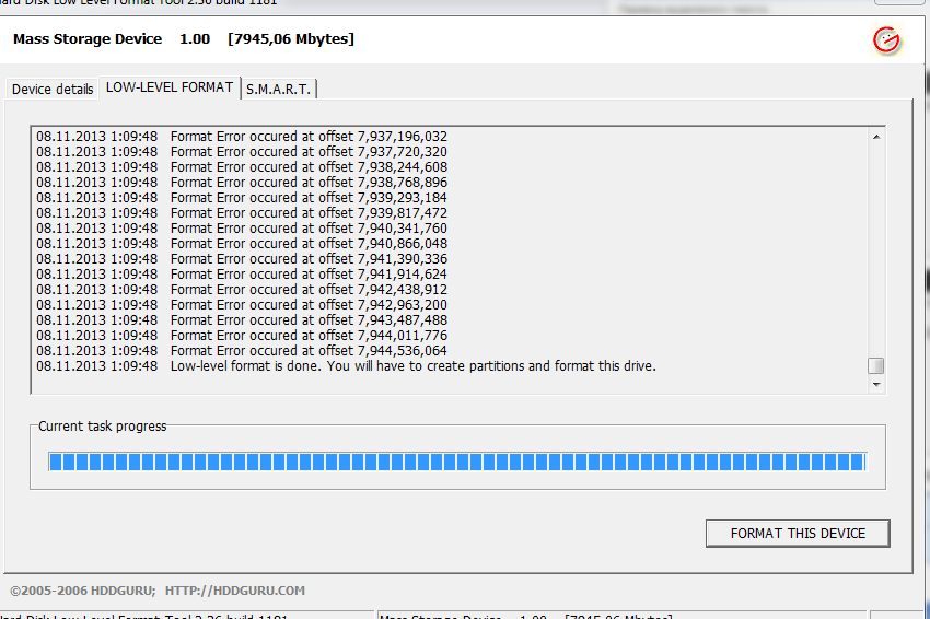 Не могу отформатировать микро сд ,без флашков , виндус7 пишет " не удается завершить форматирование" ПерепробЫвал кучу программ ,во всех процесс форматирования заканчивается с ошибкой. Винда видит флешку как диск H , пишет размер ,7.537 мб (но в свойствах пишет 0мБ) Диск не открывает просит форматировать. Программой Disk Recovery Wizard , просканировал , удалил файлы . Прога FlashMemoryToolkit_2 . после сканирования не нашла ошибок, форматировать отказывается.В остальных прогах все процессы заканчиваются с ошибками. Подскажите как мне востановить сд карточку . |
