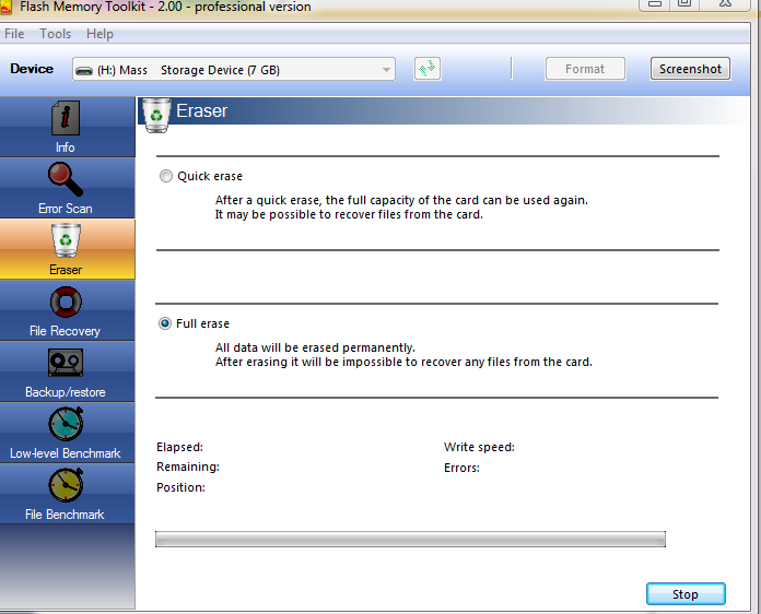 нажать кнопку Eraser и выбрать пункт Full erase. В конце операции и/или в случае ошибки снять скриншот. »