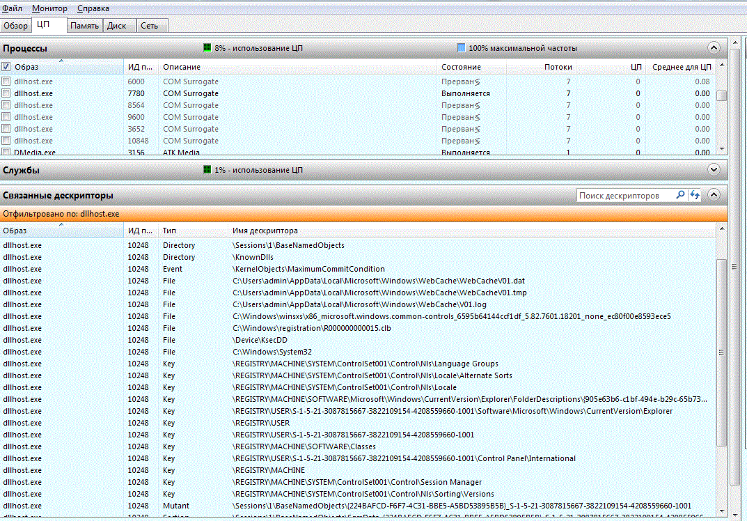 в конце концов, после того, как перещелкал все образы дллхоста, какой-то из них соблагоизволил показать дескрипторы (картинку прилагаю). Запросы в сеть на всякий случай блокировал файерволом - пока никто не сказал, что они безопасны. Добавился вопрос: какой из файлов может вызывать проблему, и безопасно ли их удалять? В примере, которым я руководствовался причиной оказался видеофайл - с ним таких вопросов не возникало |