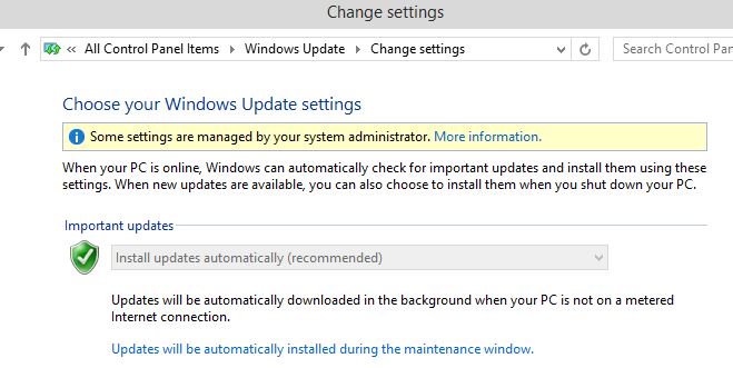 Можете посмотреть в реестре есть ли подразделы HKEY_LOCAL_MACHINE\SOFTWARE\Policies\Microsoft\Windows\WindowsUpdate\AU или HKEY_CURRENT_USER\SOFTWARE\Microsoft\Windows\CurrentVersion\Policies\WindowsUpdate - они могут содержать параметры, запрещающие изменение способов получения обновлений.