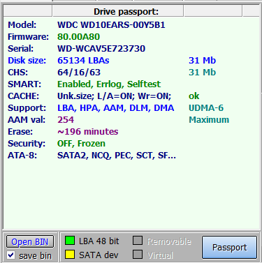 Паспорт естественно, запрашивал, как и СМАРТ. Диск был виден, но паспорт правильно не отображался, как, впрочем, и у нескольких исправных винтов, которые я подключал для пробы. Видимо, надо было играться в биосе с режимами контроллера, чего я не сделал. В результате быстрее оказалось поставить ХРю и из-под нее все быстро решилось с помощью HDD Capacity Restore Tool. ![]() |
