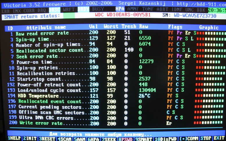 Берёте Victoria 4.46/4.47 For Windows. 1. Зпускаете утилиту и в самом левом верхнем углу клавишей Standard выбираете нужный хард. 2. По кнопке Passport читаете паспорт 3. Затем выбираете кнопку SMART ===> Get SMART --- читаете SMART Показываете рапорты... Восстановить HPA можно утилитой HDD Capacity Restore Tool |