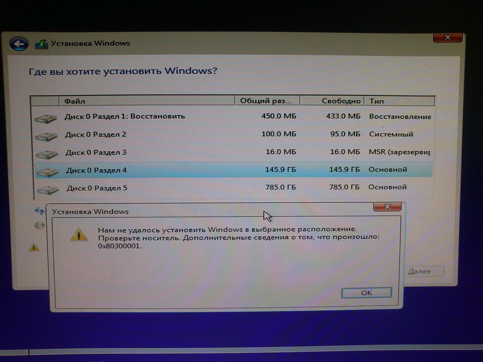 При установке windows 10 выбивает ошибку 0x80300001.