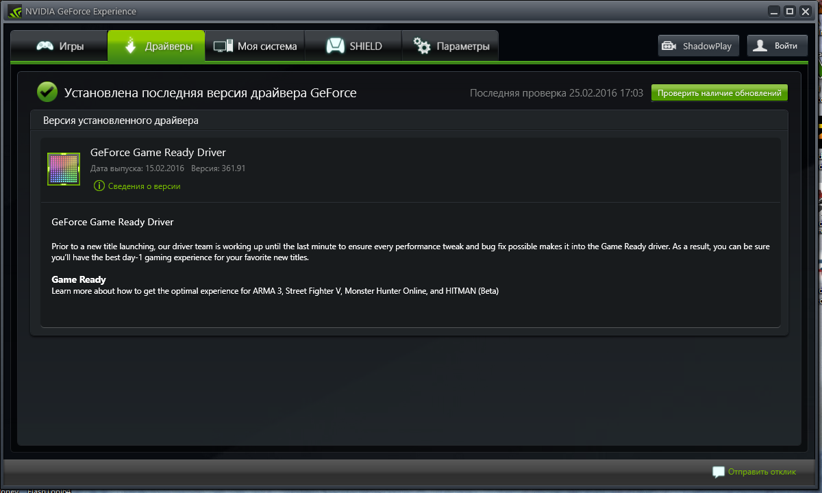Да, драйверы видяхи стоят. GeForce Expierence говорит, что самые новые. Откатываться, наверное, смысла нет, т. к. уже раза два обновились после появления проблемы. Если бы проблема проблема была в них, наверное, уже была бы исправлена... |