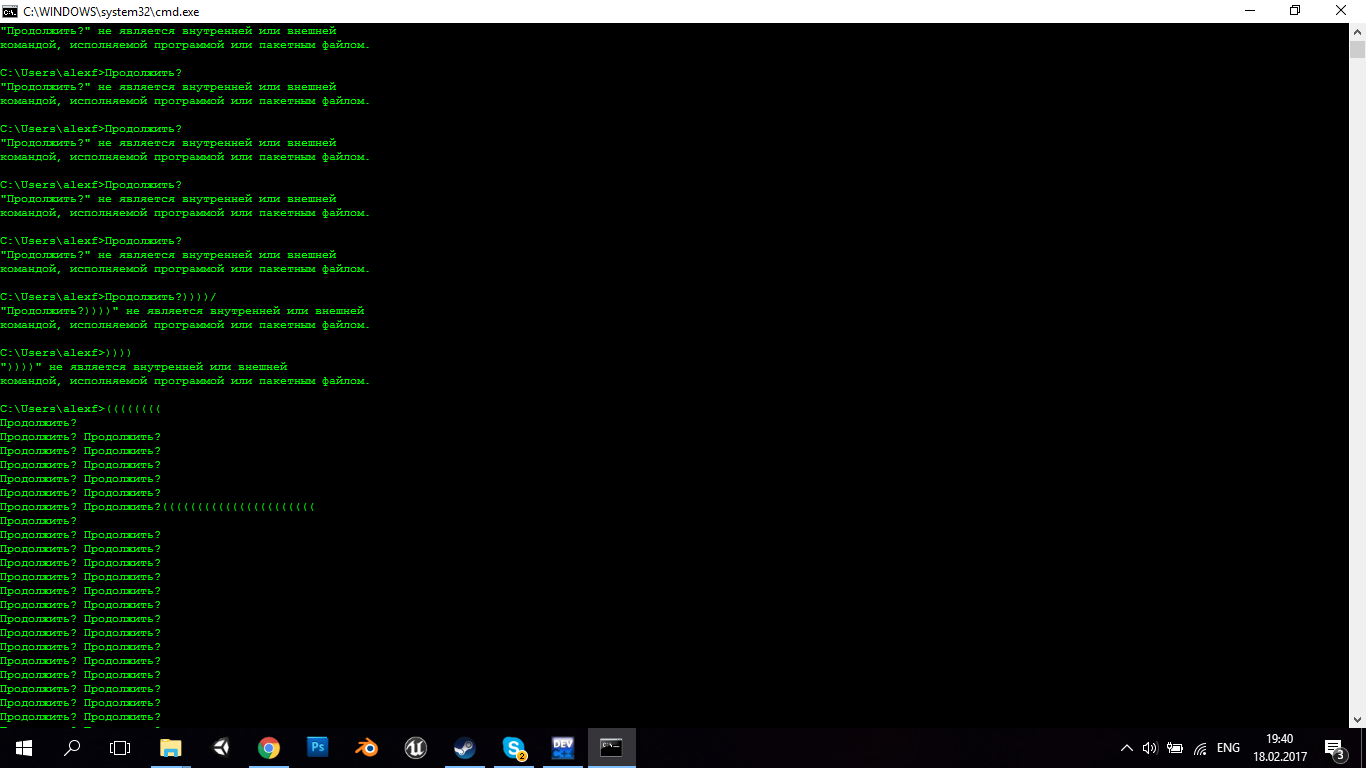 Дело в том ,что я случайно нажал на правую кнопку мыши в командной строке и начался вывод символов "((((((((" Я нажал Enter и Консоль вывела следующее: Продолжить?. Можно вводить все что угодно но результата не будет ,однако я смог входить в этот режим вводом "(((((" для выхода нужно написать "))))))))*Любой символ*" в таком случае выводится "Непредвиденное появление: ).". Очень интересно узнать что это может быть.