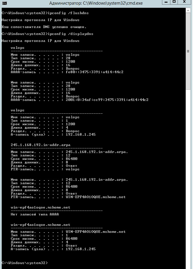 Здравствуйте. Прошу строго не судить. Имеем Windows Server 2012 R2 Standart. На нем запущен SQL и 1С-сервер. Из ролей только DNS. По vpn к нему подключаются клиенты для использования ключа защиты конфигурации 1С. Изначально было неудобочитаемое длинное имя хоста. Сгоряча переименовал через графический интерфейс, не прибегая к утилите netdom. Возникли проблемы с запуском sql-баз, но этот вопрос решил. Но теперь на удаленных станциях при попытке взять ключ возвращает старое DNS-имя. После очистки кэша dns появляется запись, содержащая старое имя. На скринах это видно. Новое имя - volops, старое - WIN-EPF4AO1OQOE.mshome.net. При попытке добавить альтернативное имя пишет - Отказано в доступе. (netdom computername WIN-EPF4AO1OQOE.mshome.net /add:volops.mshome.net) При этом с самого сервера пингуется имя volops и WIN-EPF4AO1OQOE, возвращает 192.168.1.245. Как избавиться от имени WIN-EPF4AO1OQOE??