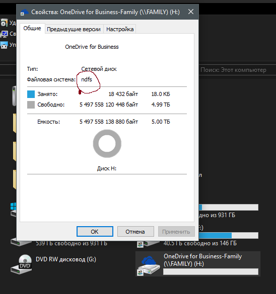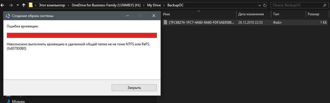 Windows 10 Pro Версия 1809 Сборка 17763.195 При попытки создания образа системы через резервное копирование и восстановление Windows c сохранением в сетевой папке (папка в облаке OneDrive-Businnes 5ТБ) почти сразу выпадает сообщение о ошибке. В свойствах облачного диска обозначена файловая система ndfs. Та-же ndfs видна и в свойствах других облаков.