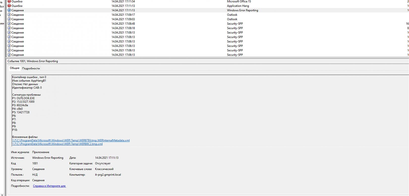 Сталкнулся с такой проблемой что при поиске определенных сообщений (с указанием конкретных эл.ящиков) outlook повисает намертво! (Но если отключить службу индексации для outlook? то все становиться нормально) Ниже прилагаю логи и всякое (Пробовал править файл пользователя, + пробовал на чистой машине + пробовал переиндексировать ящик) |