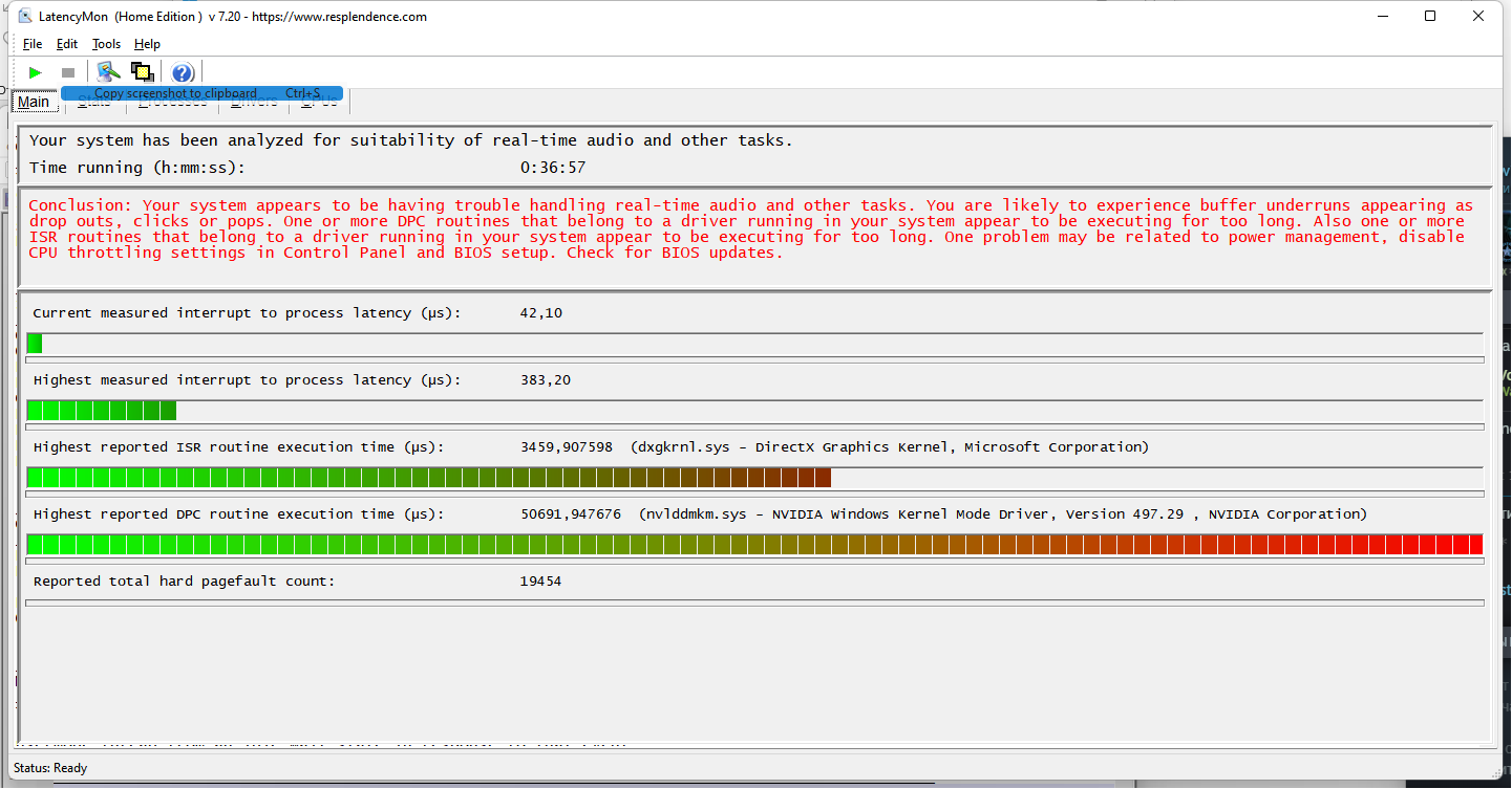 Извините, если не туда запостил, я не знаю проблема вызвана железом или софтом, но думаю, что это наиболее подходящий раздел. Проблема следующая: Происходит фриз картинки и звука: вместо видео слайдшоу, а звук заедает. Длится около 1-2 секунд. Регулярность - довольно редко, в среднем 1-3 раза за день. Условия в которых происходит: в игре либо при просмотре видео в браузере. Возможно, и в другие моменты происходит, просто незаметно из-за статичности картинки и отсутствия звуков. Погуглив похожие темы не нашел какого-то пошагового метода проверки, у каждого виновником оказалось что-то своё - бп, оперативка и тд. Поэтому прошу подсказать оптимальный путь проверки, что и как.. Полезные факты и что уже проверил: Судя по всему дело не в ОС и не в SSD на который установлена система т.к. на днях приобрел новый SSD и установил на него Win11 с нуля (официально с сайта MS, без каких-то модификаций), проблема сохранилась. Никаких разгонов железа нет и не было. В журнале событий ОС ("Просмотр событий") ничего подозрительного не нашел, в разделе "Журналы windows - Система" вообще никаких записей не появляется на то время когда происходит фриз. Менять каждую железку в компе на другую и исключать таким образом возможности нет.. Прикрепил скриншот из latencymon, видел в нескольких похожих темах, что она может определить причины подобных задержек, я не особо понимаю как интерпретировать результаты этой программы, но вроде бы показывает, что всё ок. Актуальный конфиг железа в профиле. |