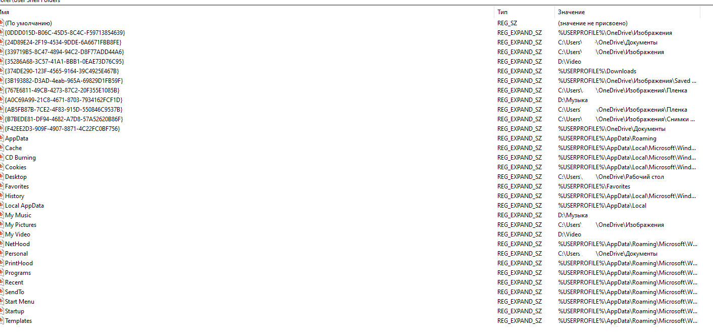 Покажите раздел реестра HKEY_CURRENT_USER\Software\Microsoft\Windows\CurrentVersion\Explorer\User Shell Folders |