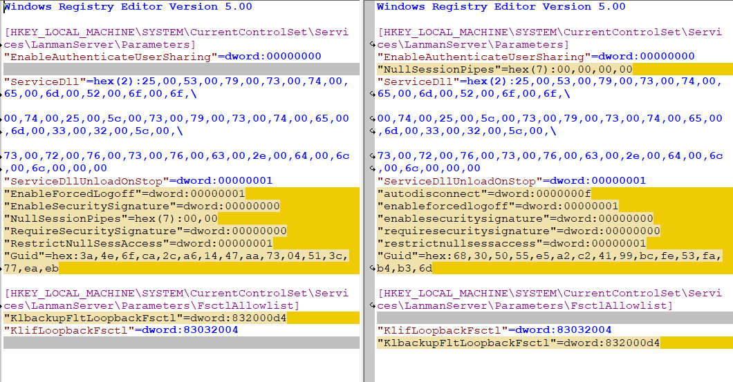 [HKEY_LOCAL_MACHINE\SOFTWARE\Microsoft\Windows\CurrentVersion\Policies\System] "ConsentPromptBehaviorAdmin"=dword:00000005 "ConsentPromptBehaviorUser"=dword:00000003 "DSCAutomationHostEnabled"=dword:00000002 "EnableCursorSuppression"=dword:00000001 "EnableFullTrustStartupTasks"=dword:00000002 "EnableInstallerDetection"=dword:00000001 "EnableLUA"=dword:00000001 "EnableSecureUIAPaths"=dword:00000001 "EnableUIADesktopToggle"=dword:00000000 "EnableUwpStartupTasks"=dword:00000002 "EnableVirtualization"=dword:00000001 "PromptOnSecureDesktop"=dword:00000001 "SupportFullTrustStartupTasks"=dword:00000001 "SupportUwpStartupTasks"=dword:00000001 "ValidateAdminCodeSignatures"=dword:00000000 "dontdisplaylastusername"=dword:00000000 "legalnoticecaption"="" "legalnoticetext"="" "scforceoption"=dword:00000000 "shutdownwithoutlogon"=dword:00000001 "undockwithoutlogon"=dword:00000001 [HKEY_LOCAL_MACHINE\SOFTWARE\Microsoft\Windows\CurrentVersion\Policies\System\Audit] [HKEY_LOCAL_MACHINE\SOFTWARE\Microsoft\Windows\CurrentVersion\Policies\System\UIPI] [HKEY_LOCAL_MACHINE\SOFTWARE\Microsoft\Windows\CurrentVersion\Policies\System\UIPI\Clipboard] [HKEY_LOCAL_MACHINE\SOFTWARE\Microsoft\Windows\CurrentVersion\Policies\System\UIPI\Clipboard\Exceptio nFormats] "CF_BITMAP"=dword:00000002 "CF_DIB"=dword:00000008 "CF_DIBV5"=dword:00000011 "CF_OEMTEXT"=dword:00000007 "CF_PALETTE"=dword:00000009 "CF_TEXT"=dword:00000001 "CF_UNICODETEXT"=dword:0000000d Различия имеются только у тех двух веток (см. выше). |