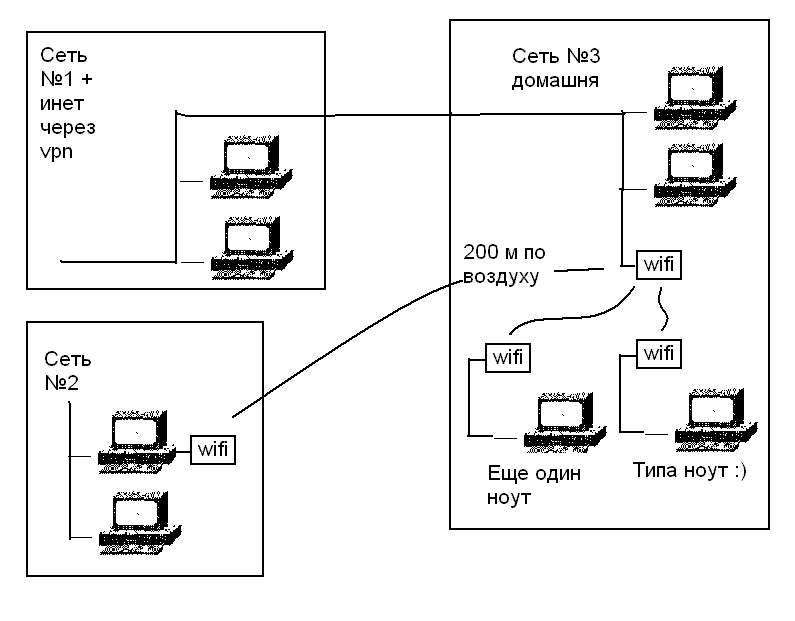 - в районе сети 1 ставится обычный (проводной) роутер и раздает и-нет на компы сети 1 и в сеть 3; - в сети 3 входящий от сети 1 шнур от роутера идет в беспроводную точку доступа (достаточно 4-х-портовой); - сеть 2 с помощью Wi-Fi роутера (или двух отдельных PCI или USB-адаптеров) пытается поймать сигнал точки доступа (сомневаюсь, что сила сигнала позволит связать сети на приличной скорости). |