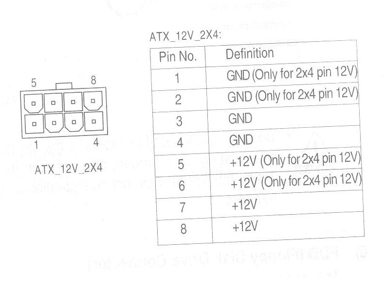 Люди, помогите, пожалуйста. На материнской плате (Jetway P4M9MP) имеется восьмиконтактный разъем стандарта EPS12V вместо привычного 4-штырькового для доп. питания процессора. Нужно узнать напряжение на контактах, в мануале к плате нет (скрин прилагаю), в нете не нашел (часа два копался, не меньше).
