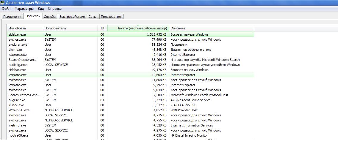 Вот такая странная вещь стала происходить у меня. Всё работало нормально и вдруг замечаю что памяти стало много "есть". Смотрю а это Sidebar уже добрался до 1.5 GB. Раньше он максимум брал до 50 MB. Сейчас он просто взлетает за день. Когда я перезагружаю комп или убиваю процесс он возвращается к 20 Mb и опять по новой растёт до 1.5 GB. Не знаю что и делать. Комп у меня 4 ядра и 4GB памяти но всё равно так не бьло и не должно быть. Кто знает как решить эту проблему?