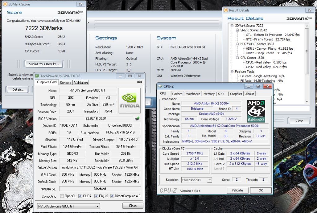 Недавно купил б\у Palit 8800Gt 512 вместо 8600gt 256, сразу же поставил Вин7 x64 Корпоративную вместо XP x64. Заметил сильные тормоза: например, в CRYSIS (warhead) трудно играть даже с 1680*1050 noAA MIN, если где-нибудь в лесу без врагов\союзников ФПС 30-40, то в "поселениях" и с другими игроками не более 20 (CRysis 1.2 тесты DX9 1014&768 High: GPU 7.23\22.71\32.29, CPU 7.67\22.52\30.88).