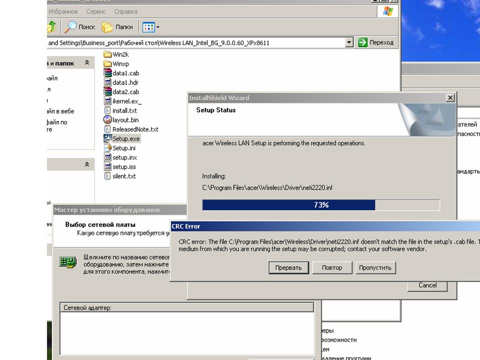 Профиль | Отправить PM | Цитировать Да с этого сайта скачивал. С архива intel вообще не понятно что устанавливается, адаптер в диспетчере не появляется, с помощью мастера установки оборудования тоже ничего установить не получается. в *ini файле изменения как вы посоветовали сделал, в результате запуска инсталятора выскакивает ошибка. А с начала и правда Atheros прикрутить пытался