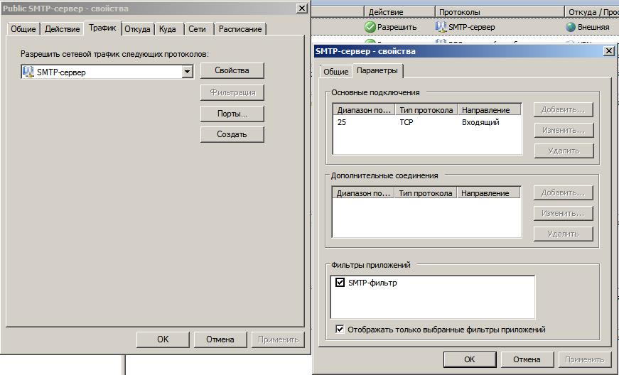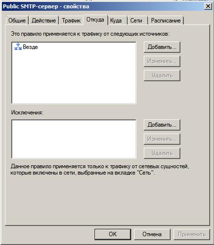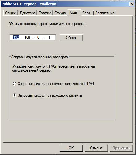 Профиль | Отправить PM | Цитировать Отключите правило публикации и попробуйте соединиться с сервером, посмотрите будет ли регистрироваться входящий запрос на порт 25. Посмотри еще раз Каспера может он все таки как то блокирует трафик. Ну и попробуйте на закладке "Куда" свойств правила публикации выставить "Запросы приходят от Forefront TMG".