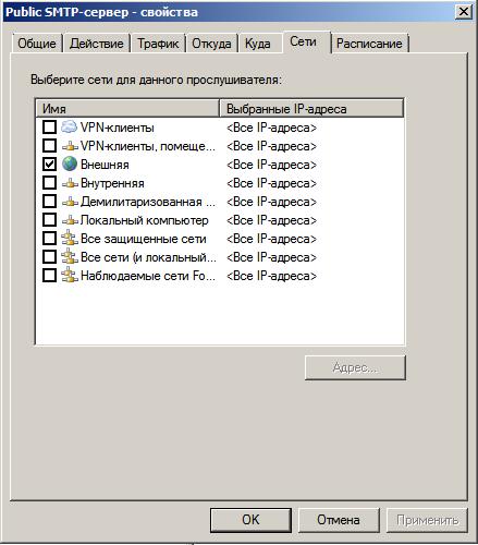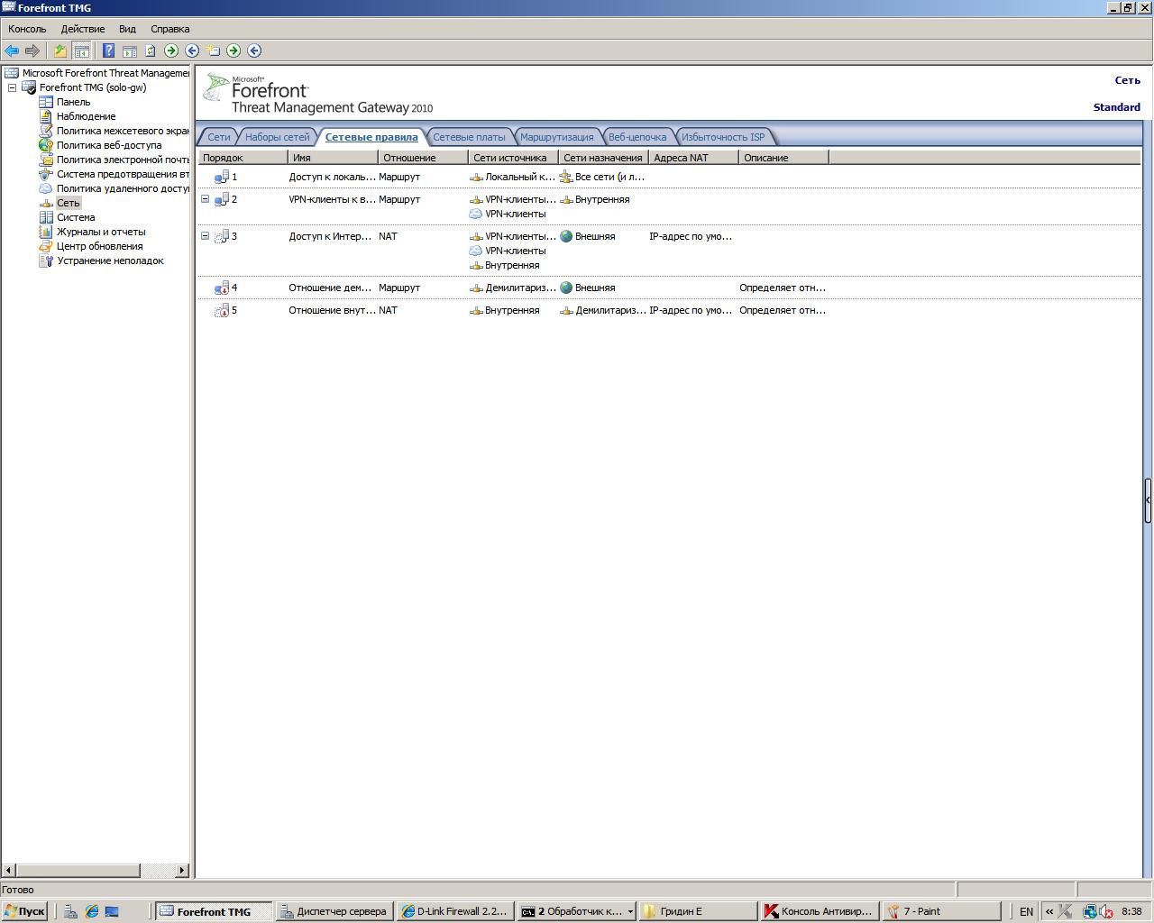 имеем Сервер1: Win2k3SP2 SBS R2 (AD,DNS,WINS,DHCP,SQL2005,Exchange2003) (внутренний:192.168.0.1) Сервер2: Win2k8 TMG (внешка:192.168.10.252, внутренний:192.168.0.252) Exchange2003 настроен почту внутри сети принимает\отправляет. telnet'ом на 25 порт коннектится. TMG публикую стандартным визардом почтовый сервер добавил правило на исходящий SMTP пытаюсь подключиться снаружи на 25 порт к в журнале регистрации пакетов вообще нет пытаюсь телнетом с этого же сервака подключиться к самому себе в журнале: Неудачная попытка соединения Тип журнала: Служба межсетевого экрана Состояние: 0x8007274c WSAETIMEDOUT Правило: Public Mail SMTP-сервер Источник: Внешняя (192.168.10.252:33034) Назначение: Внутренняя (192.168.0.1:25) Протокол: SMTP-сервер с днс проблем быть не должно потому как рядом стоит второй сервак только с win2k3 Isa2004, Mdaemon. вся почта нормально ходит. Но он будет выводиться полностью. |