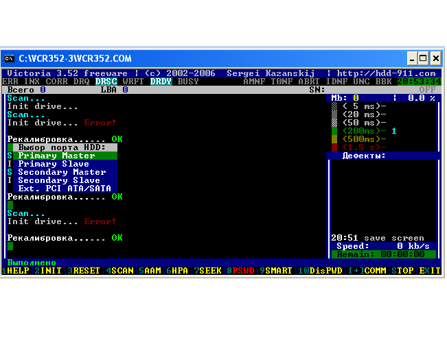 Не может такого быть, чтобы у Вас не заработало…. Должно работать. Лень вам документацию читать… ---- надо выбрать канал --- (контроллер ===>> диск) Для MHDD сделайте, как в этой статье советуют http://thinkit.ru/blog/viewblog/520/ Alt+F2 -- выбор канала F4 --- сканирование Для Victoria for DOS почти так же... P (лат.) --- Выбор канала F4 --- сканирование ЗЫ Только тест линейного чтения запустите --- ничего не затирайте. Если с флопика --- лог по F10 сохраняете. Если с CD --- сфотографируйте или карандашик в руки… ЗЗЫ Сканирование идёт порядка 1-2 часов…. |