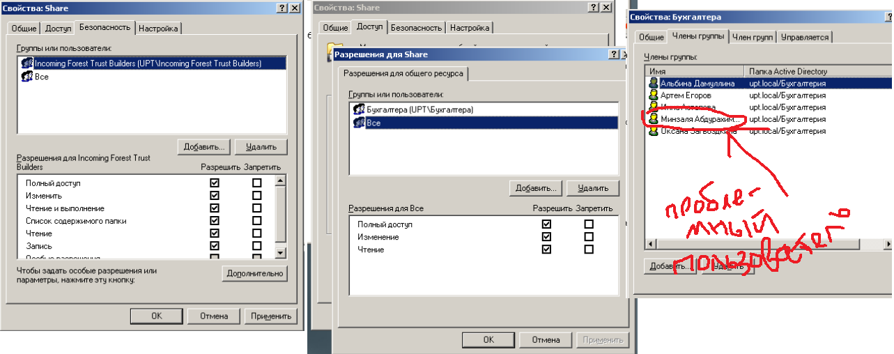 Профиль | Отправить PM | Цитировать Пользователь входит в группу бухгалтера. Соответственно в разрешениях эта группа присутствует, но в связи с тем что один пользователь из этой группы не может зайти в общую папку пришлось открыть всем общий доступ.
