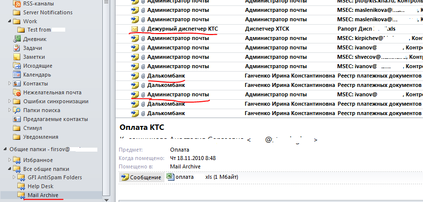 Профиль | Отправить PM | Цитировать У меня вся почта сыпится в общую папку (Mail Archive). Результат виден во вложении. Там есть и кому, и копия, и размер и все остальное. Может быть, просто не выбраны столбцы при просмотре общей папки?