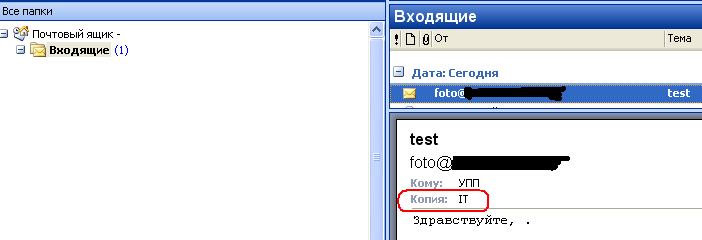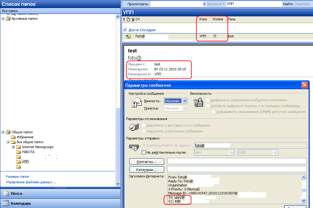 Delirium, спасибо за совет про столбцы, сам что-то затупил ![]() вот пример отправляю с ящика FOTO@xxx.yy письмо в общую папку с ассоциированным адресом UPP2@xxx.yy и копию на адрес IT@xxx.yy ss-01.PNG = вот так письмо видится в общей папке. информация об адресатах копии письма видна только если посмотреть в заголовки или в столбцы списка. ss-02.PNG = вот так письмо видится в почтовом ящике. все адресаты отображаются красиво. при нажатии кнопки "Ответить всем" в в личной папке формируется ответ всем адресатам, а общей папке - только отправителю, а надо чтоб всем. Если добавить столбцы "Кому" и "Копия" в отображаемые столбцы в общей папке, то там пишется все верно, т.е. информация не теряется и отображается. А как можно добавить эти поля в список в окошке сообщения? |
