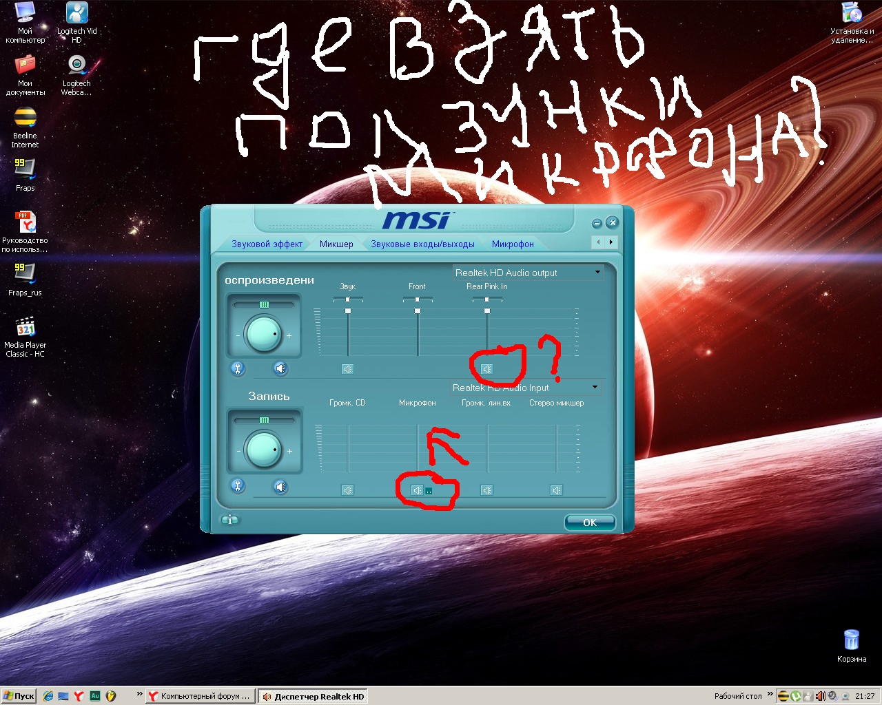 Профиль | Отправить PM | Цитировать Здравствуйте! Весь вечер бьюсь над подключением микрофона. Проблема в том, что у меня неактивны доп. параметры в настройках звука, а соответственно я не могу поставить галочку Усиление микрофона. И в настройках микшера тоже ничего нет. Уже несколько раз переустанавливала драйвер realtek и 2.7 и 2.67 ставила - одно и то же. Микрофон BBK DM-140