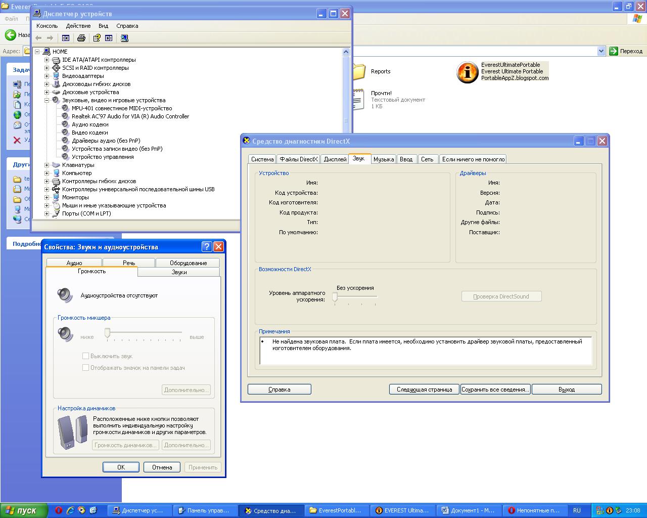 Конфиг: Тип ЦП AMD Sempron, 1500 MHz (9 x 167) 2200+ Системная плата Acorp 7KT600 (5 PCI, 1 AGP, 3 DIMM, Audio) Чипсет системной платы VIA VT8377 Apollo KT600 Звуковой адаптер C-Media CMI9739A/9761 @ VIA AC'97 Enhanced Audio Controller Звук в БИОСе включен. Windows XP SP3 со всеми обновлениями. После переустановки системы автоматически установились все устройства кроме аудиоконтроллера и встроенного raid-контроллера. С оффсайта системной платы были скачаны и установлены драйвера на чипсет, raid и по-моему на lan. На звук драйверов нет. На сайте C-Media тоже пусто. Была проинтегрирована в систему сборка-пакет звуковых драйверов. Система в автоматическом режиме подхватила драйвер «Vinyl AC’97 Codec Combo Driver (WDM)», однако в процессе установки произошла перезагрузка системы (по-моему при копировании файла Vinyl97.sys), причем без экрана BSOD и без записи в журнал событий. После перезагрузки восклицательные знаки появились на DVD приводах и самой звуковой плате. Далее все устройства встали нормально, однако звука не было. В дальнейшем скачал несколько драйверов на эту звуковуху из разных источников (типа drivers.ru и nix.ru, а также с via.com.tw), результаты каждый раз были разные (от BSOD до нормальных установок), но звука так ни разу и не было. Ставил и на чистую систему и не на чистую. В данный момент имею такую ситуацию как на скриншоте. Такая же конфигурация возможна и с драйверами «Vinyl AC’97 Codec Combo Driver (WDM)» Дальше не знаю что делать. Есть подозрение на аппаратную неисправность звуковухи, блок питания, но его поменять нет возможности. Надеюсь на вашу помощь. PS: Драйвера на звук всегда ставились только после установки всех других драйверов. PS2: Причиной переустановки системы были перезагрузки при установке драйверов на web камеру (как оказалось в последствии из-за недостатка питания на USB портах). Кроме того пользователи жаловались на некие сильные шумы в наушниках и колонках. |