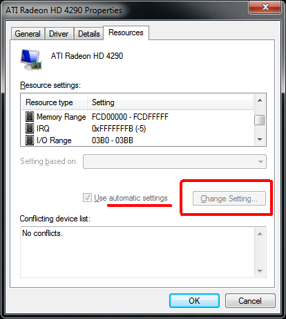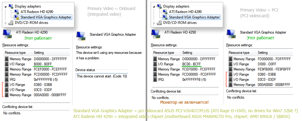 1) интегрированную 2) PCI Они явно конфликтуют из-за адресов памяти: 000A0000 - 000BFFFF И портов ввода вывода 03B0 - 03BB 03C0 - 03CF Выражается в том, что видеокарта, которая запускается второй - не работает (порядок запуска выставляется в BIOS). А запустившаяся первой - работает нормально. Если первой запускается интегрированное видео, то PCI карта вообще отказывается работать и в диспетчере устройств иконка подсвечивается желтым треугольником с восклицательным знаком (Device can not start, Code 10). Если же первой запускается PCI, то тогда монитор, подключенный к интегрированной видеокарте даже не включается (мигает лампочкой в режиме ожидания), хотя в диспетчере устройств никаких конфликтов нет - иконка видеоадаптера не подсвечивается как для неработающих устройств. Но ресурсов встроенная видеокарта резервирует меньше (не хватает как раз тех самых адресов, что выше). Вот схема - здесь показаны скриншоты занимаемых видеокартами ресурсов: Хочу заставить работать одновременно две видеокарты - встроенную в мать (интегрированную) и старенькую PCI. Факты того, что onboard видео может работать вместе другой видеокартой есть. Главное разобраться как решить этот конфликт. Чисто системная задача. - Включал/отключал Plug'n'Play в BIOS - не помогло. - Менял PCI слот - не помогло - Запускал MicrosoftFixit - просто переинсталлировало драйвер Standard VGA и больше ничего Изменять ресурсы устройств Windows 7 (32bit) вроде-бы не дает: Вопрос: как разрулить ресурсы? _ |
