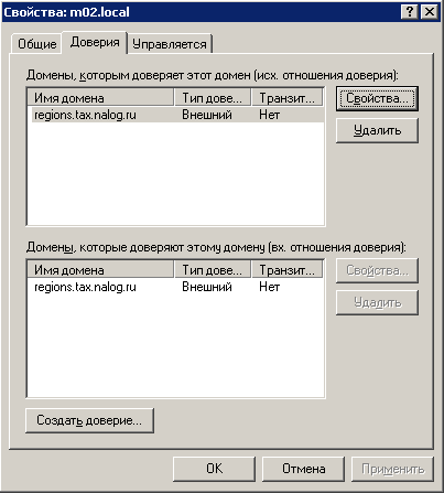 Покажите скрин настроек с КД:Пуск->Администрирование->Active Directory - домены и доверие->имя Вашего домена->Свойства->Закладка Доверия. »