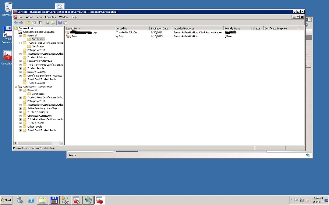 ситуация следующая: Платформа Win server 2008 R2. Установка сертификата в менеджере ИИС происходит успешно, но если обновить менеджер (F5), то сертификат пропадает из списка. И, соответственно в окне Bindings, при добавлении https, сертификат отсутствует в меню. При этом если открыть сертификаты через консоль ММС, то его можно увидеть в папке Personal. Есть ли какая-либо возможность сделать так чтоб веб-сервер "увидел" этот сертификат? Подскажите как решить эту проблему, заранее спасибо! PS. Сертификат приобретен в tawte. Все что мне предоставили, это данные аккаунта, где можно просто с копи-пастить сертификат в 2 вариантах: PKCS#7 и X.509. Сохранил оба варианта в блокноте с расширением *.p7b и *.cer соответственно. Пробовал оба варианта вставки через консоль ИИС, вставился только тот который Х.509, второй - только через ММС импортировался. |