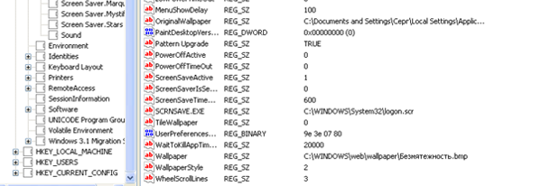 Wallpaper точно такой как у вас C:\WINDOWS\web\wallpaper\Безмятежность.bmpЕдинственно, в вашем реестре значение WallpaperStyle =0, а моем =2 |