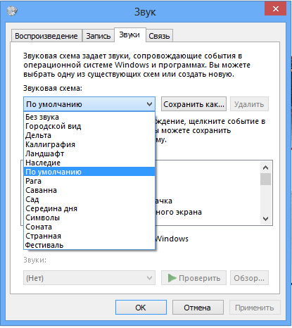 Donc, установите звуковую схему по умолчанию (Звук=> Звуки=> Звуковая схема).