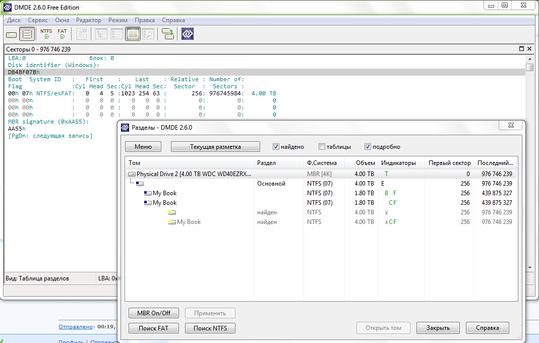 Имею новый внешний USB HDD объемом 4ТБ, заполнено около 700ГБ. Захотел познакомить его со своим плеером WDTV Live, который любит автоматически создавать на жестком диске библиотеку файлов. Но ввиду своего возраста ему видимо не знакомы диски такого объема, поэтому дружить он с ним не стал. После подключения обратно к компу Windows 7 x64 предложила его (что уж там) отформатировать! Вобщем, симптомы для вас обычные... В управлении дисками RAW, 0 кб и тому подобное... Предлагаемая везде и всеми чудо-утилита DMDE разделы вроде как видит, файлы отдельные восстанавливает. Просто в данный момент не могу сделать одномоментно копию 700-800 гигабайт информации. Хотел бы узнать о тяжести моего случая и возможно ли безболезненное восстановление диска без использования других HDD? Приложил пару файлов для установления диагноза. Надеюсь на вашу помощь и благодарю! |