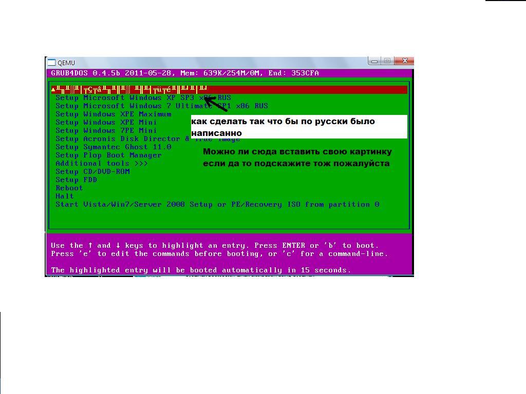 Сделал мультизагрузочную флэшку, но не знаю как заменить буквы английские на русские, при обычной замене не отображаються. И как вставить свою картинку? Помогите если кто знает я очень хочю научиться фото и код в блокноте ниже. Подскажите что на что заменить в нём что-бы отобразились русские буквы.