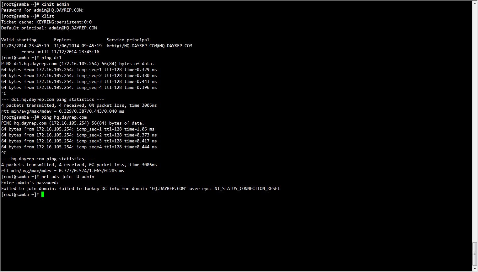 [root@samba ~]# realm join --user=Administrator@corp.wildfire.com corp.wildfire.com Password for Administrator@corp.wildfire.com: See: journalctl REALMD_OPERATION=r798.2514 realm: Couldn't join realm: Joining the domain corp.wildfire.com failed [root@samba ~]# journalctl REALMD_OPERATION=r798.2514 -- Logs begin at Mon 2014-11-03 07:19:44 EST, end at Mon 2014-11-03 07:33:06 EST. -- Nov 03 07:33:02 samba realmd[2517]: * Resolving: _ldap._tcp.corp.wildfire.com Nov 03 07:33:02 samba realmd[2517]: * Performing LDAP DSE lookup on: 172.16.101.135 Nov 03 07:33:02 samba realmd[2517]: * Successfully discovered: corp.wildfire.com Nov 03 07:33:06 samba realmd[2517]: * Required files: /usr/sbin/oddjobd, /usr/libexec/oddjob/mkhomedir, /usr/sbin/sssd, /usr/bin/net Nov 03 07:33:06 samba realmd[2517]: * LANG=C LOGNAME=root /usr/bin/net -s /var/cache/realmd/realmd-smb-conf.1K3OOX -U Administrator@corp.wildfire.com ads join corp.wildfire.com Nov 03 07:33:06 samba realmd[2517]: Enter Administrator@corp.wildfire.com's password: Nov 03 07:33:06 samba realmd[2517]: Failed to join domain: failed to lookup DC info for domain 'corp.wildfire.com' over rpc: NT_STATUS_CONNECTION_RESET Nov 03 07:33:06 samba realmd[2517]: ! Joining the domain corp.wildfire.com failed [root@samba ~]# |